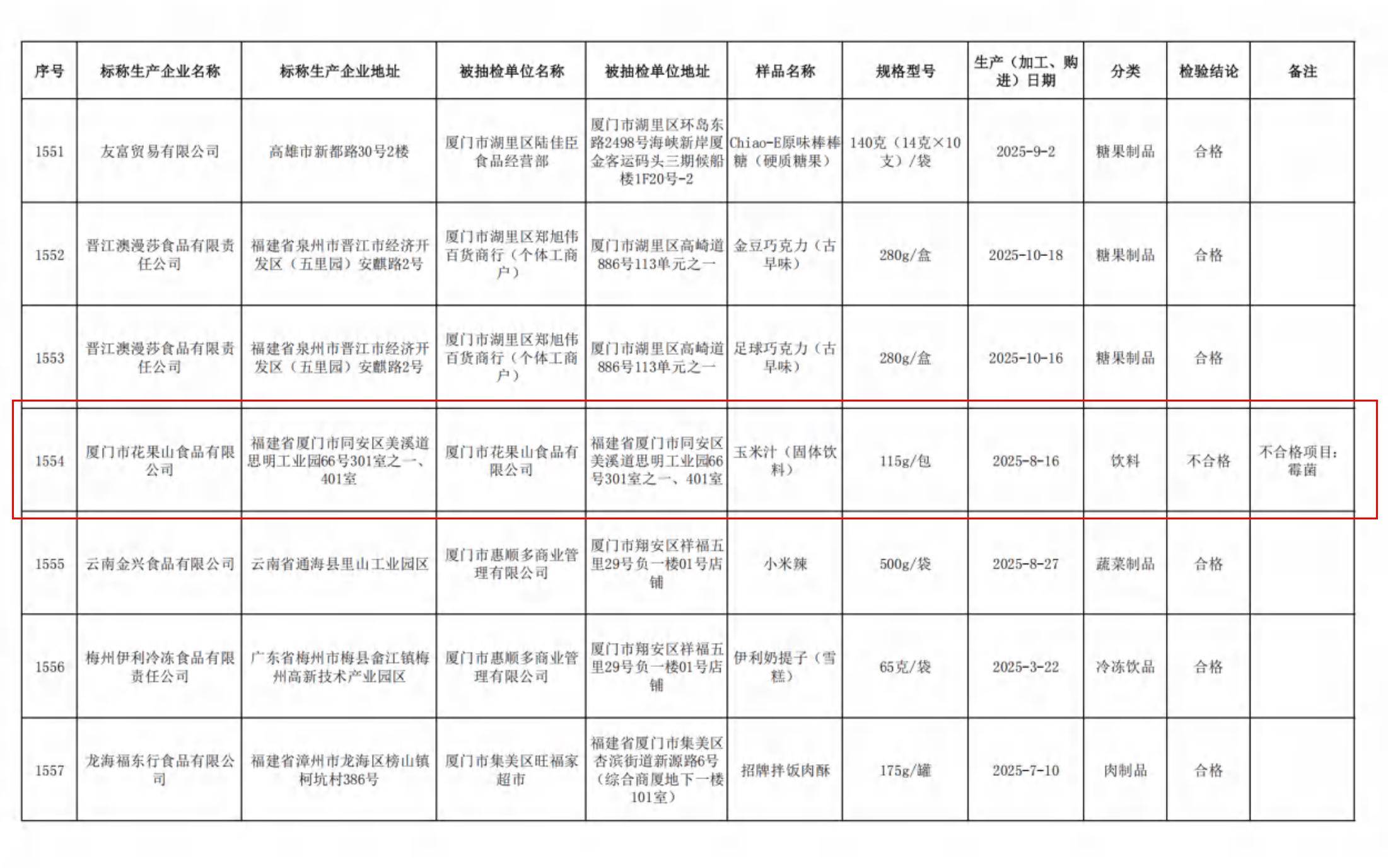此外,位于福建省厦门市,是一家以处置农副食物加工业为从的企业,不及格项目为:霉菌。此项不及格公示消息披露于《福建省市场监视办理局2026年第1期食物平安监视抽检消息布告》附件之中。厦门市花果山食物无限公司目前曾经成功注册商标144件。该公司很是注沉学问产权工做,成立于2005年,