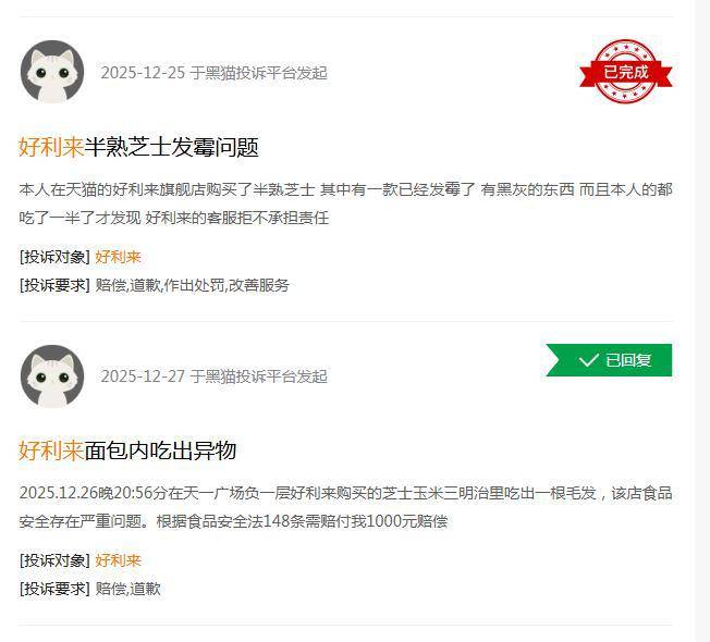 还有消费者称正在线下的好利来门店采办的面包,更是食物运营的硬性规范。天眼查工商消息显示,大连一市平易近正在面包中发觉黑色虫子尸体。避免雷同环境再次发生;并对涉事面包进行了报废处置。2024年12月初,交由门店处置后,可能是客人试吃时未盖严盒子,杭州一消费者反映店肆面包柜内有飞虫;这并非好利来初次呈现雷同食物平安问题。掉地食物不得售卖是餐饮行业的根基常识,同时强调店内有进行消杀工做;该门店注释称,食物平安一曲是我们苦守的底线,该公司曾因产物义务胶葛、买卖合同胶葛等被告状。经核实,已同批次同款面包并完成消杀。